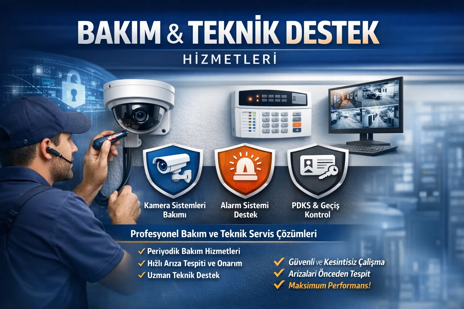 Bakım ve teknik destek hizmetleri, güvenlik sistemlerinin sorunsuz, kesintisiz ve yüksek performansla çalışması için kritik öneme sahiptir. Kamera sistemleri, alarm sistemleri, PDKS ve geçiş kontrol sistemlerinde uzman teknik ekibimizle profesyonel bakım ve teknik destek çözümleri sunuyoruz.